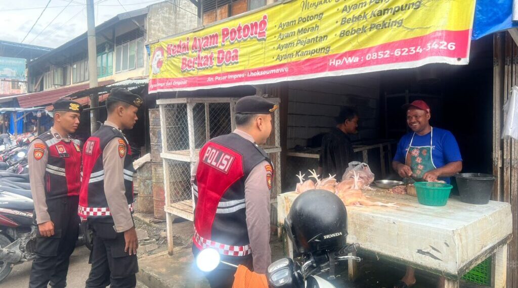 Lhokseumawe – Suasana pasar tradisional di Kota Lhokseumawe tampak lebih tertib dan aman. Hal ini berkat kehadiran personel Polres Lhokseumawe yang melaksanakan patroli rutin guna memastikan keamanan masyarakat, Sabtu pagi (13/9/2025).