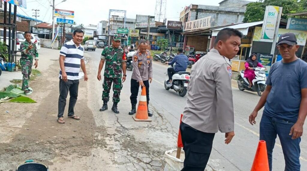 Aceh Utara – Polisi, TNI bersama perangkat desa setempat bergotong royong menambal jalan berlubang di Jalan Medan–Banda Aceh, tepatnya di depan Bank Aceh Syariah Desa Blang Peuria, Kecamatan Samudera, Kabupaten Aceh Utara, Senin (20/10/2025).