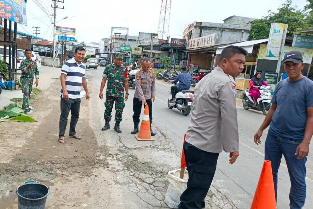 Aceh Utara – Polisi, TNI bersama perangkat desa setempat bergotong royong menambal jalan berlubang di Jalan Medan–Banda Aceh, tepatnya di depan Bank Aceh Syariah Desa Blang Peuria, Kecamatan Samudera, Kabupaten Aceh Utara, Senin (20/10/2025).