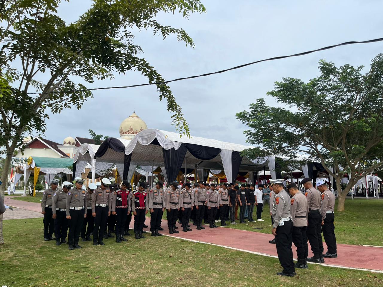 LHOKSUKON – Polres Aceh Utara mengerahkan puluhan personel untuk melaksanakan pengamanan kegiatan Maulid Akbar dalam rangka memperingati Hari Lahir Nabi Besar Muhammad SAW 1447 Hijriah yang dipusatkan di halaman Kantor Bupati Aceh Utara, Selasa (7/10/2025). Kegiatan yang diselenggarakan oleh Pemerintah Kabupaten Aceh Utara ini juga dirangkai dengan Muzakarah Ulama dan Umara Tahun 2025 yang menghadirkan sejumlah ulama besar dari berbagai daerah di Aceh.