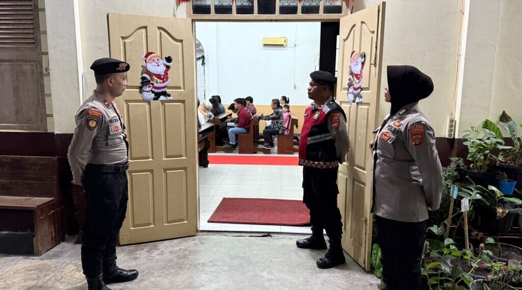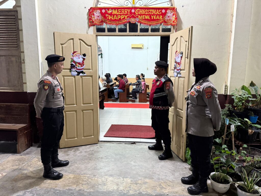 Sejumlah personel tampak ditempatkan di area pintu masuk, halaman gereja, serta melakukan patroli sekitar lokasi ibadah. Kegiatan ini merupakan bagian dari komitmen Polri dalam menjaga toleransi dan keamanan selama rangkaian perayaan Hari Raya Natal.