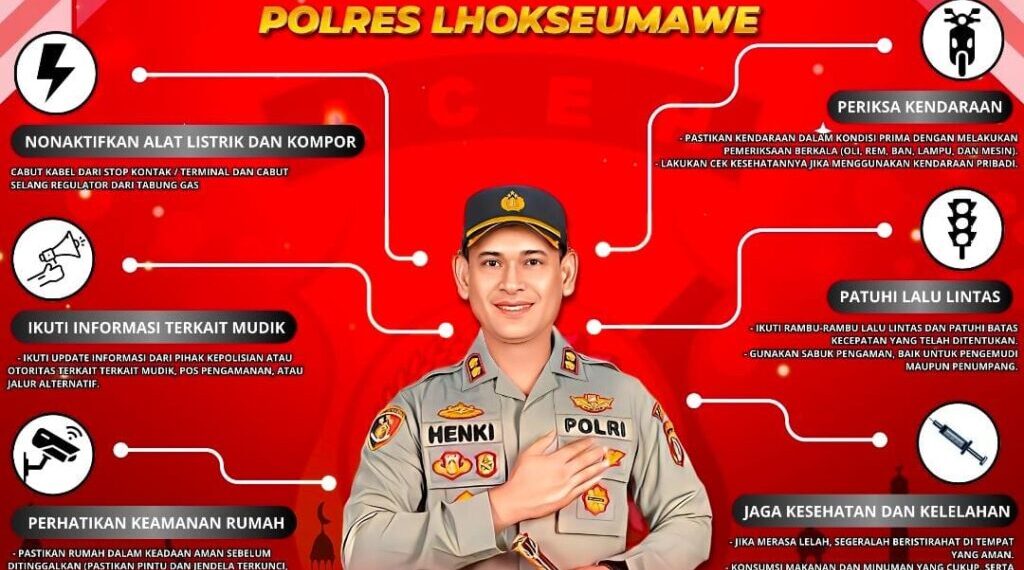 Kapolres Lhokseumawe, AKBP Henki Ismanto, SIK, mengingatkan pemudik untuk memastikan rumah dalam keadaan aman sebelum ditinggalkan, termasuk mencabut peralatan listrik dan regulator gas untuk mencegah risiko kebakaran. Selain itu, pemudik juga disarankan mengikuti informasi terkini dari pihak kepolisian atau otoritas terkait guna mengetahui kondisi jalur mudik dan titik pos pengamanan.