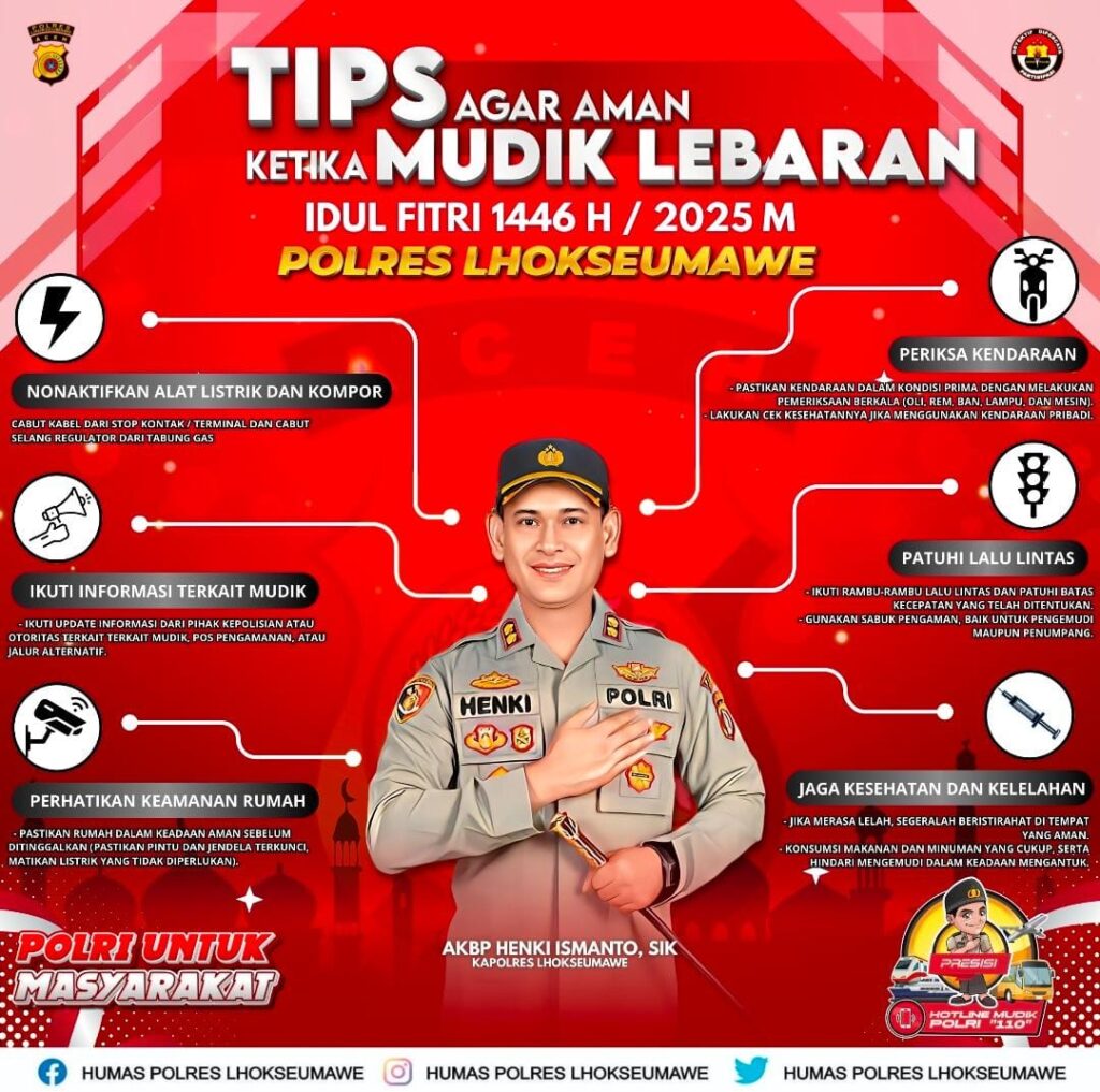 Lhokseumawe – Menjelang mudik Lebaran Idul Fitri 1446 H/2025 M, Polres Lhokseumawe membagikan sejumlah tips kepada masyarakat agar perjalanan mudik berjalan aman dan nyaman, jum’at (28/3/2025).