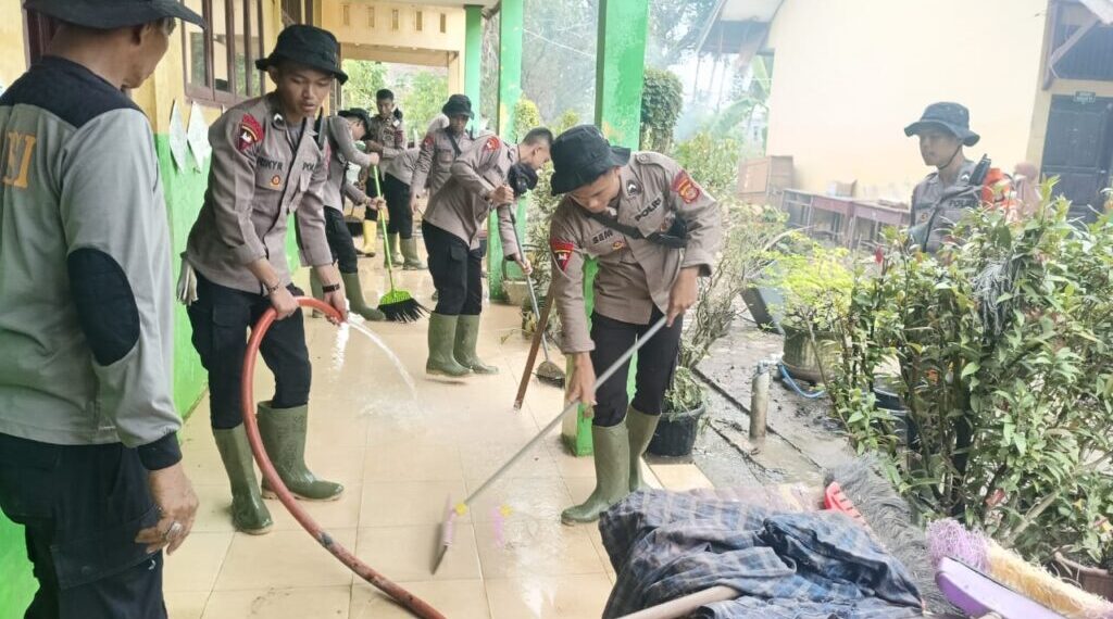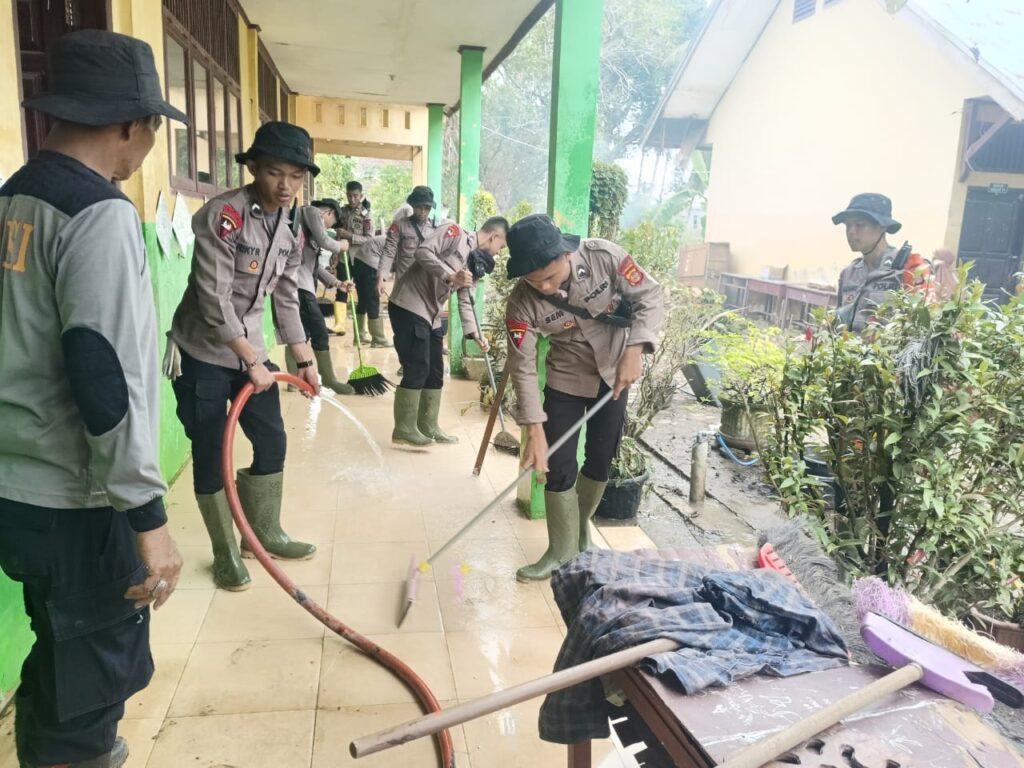 Lhokseumawe — Personel Polres Lhokseumawe bersama personel Brimob melaksanakan kegiatan pembersihan lingkungan Sekolah Dasar (SD) Negeri 12 Dewantara, Kabupaten Aceh Utara, sebagai bagian dari upaya pemulihan pascabencana banjir, Minggu (28/12/2025).