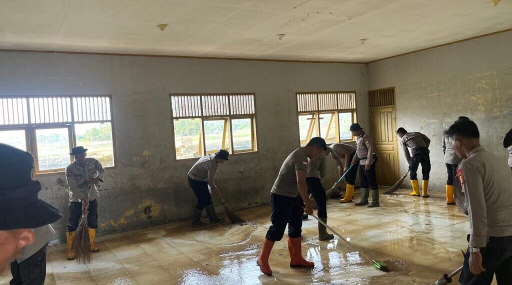 Lhokseumawe — Personel Polres Lhokseumawe bersama BKO Brimob dan Polsek Dewantara melaksanakan kegiatan pembersihan lumpur pascabanjir di SMP Negeri 2 Dewantara, Desa Glumpang Sulu Barat, Kecamatan Dewantara, Kabupaten Aceh Utara, Selasa (30/12/2025).