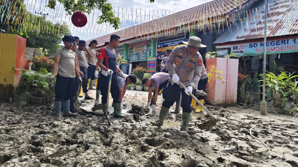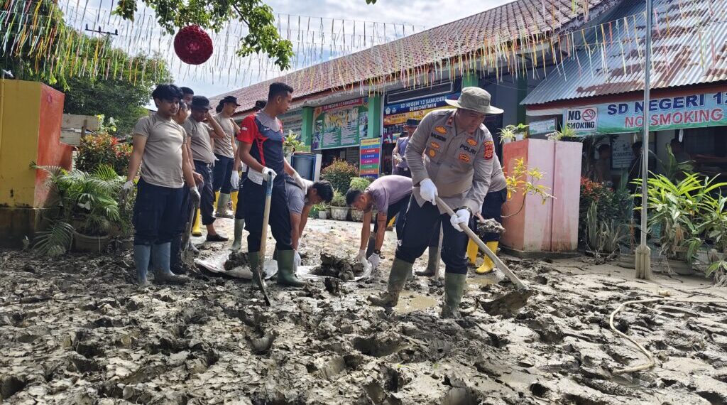 Lhokseumawe — Polres Lhokseumawe bersama personel Batalyon B Pelopor Brimob Polda Aceh melaksanakan kegiatan bakti sosial berupa pembersihan lumpur sisa banjir di SD Negeri 12 Samudera, Jalan Malikussaleh, Kecamatan Samudera, Kabupaten Aceh Utara, Provinsi Aceh, Senin (22/12/2025).