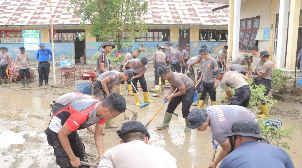 Dengan peralatan sederhana, personel Polri bersama warga setempat menyisir setiap sudut sekolah, mengangkat lumpur, serta membersihkan ruang-ruang belajar agar kembali layak digunakan. Pembersihan ini menjadi langkah awal pemulihan sarana pendidikan bagi anak-anak di wilayah terdampak banjir.