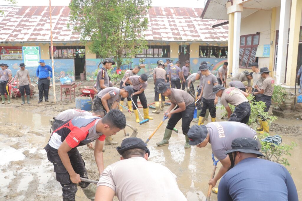 Setibanya di lokasi, personel gabungan langsung bergotong royong membersihkan lingkungan sekolah yang masih dipenuhi lumpur dan sampah sisa banjir bandang yang melanda wilayah tersebut pada 26 November 2025 lalu. Endapan lumpur tebal yang menutupi ruang kelas, halaman sekolah, dan sejumlah fasilitas penunjang menyebabkan aktivitas belajar mengajar terhenti dalam beberapa waktu.