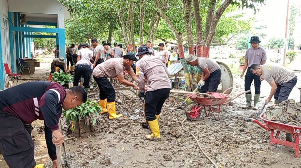 ACEH UTARA – Wujud kepedulian Polri terhadap dunia pendidikan pascabencana banjir bandang kembali ditunjukkan oleh Polres Lhokseumawe bersama Polsek Samudera dan BKO Brimobda Kaltim. Puluhan personel dikerahkan untuk melaksanakan kegiatan pembersihan SMA Negeri 1 Samudera di Desa Blang Peuria, Kecamatan Samudera, Kabupaten Aceh Utara, Provinsi Aceh, Jumat (9/1/2026).