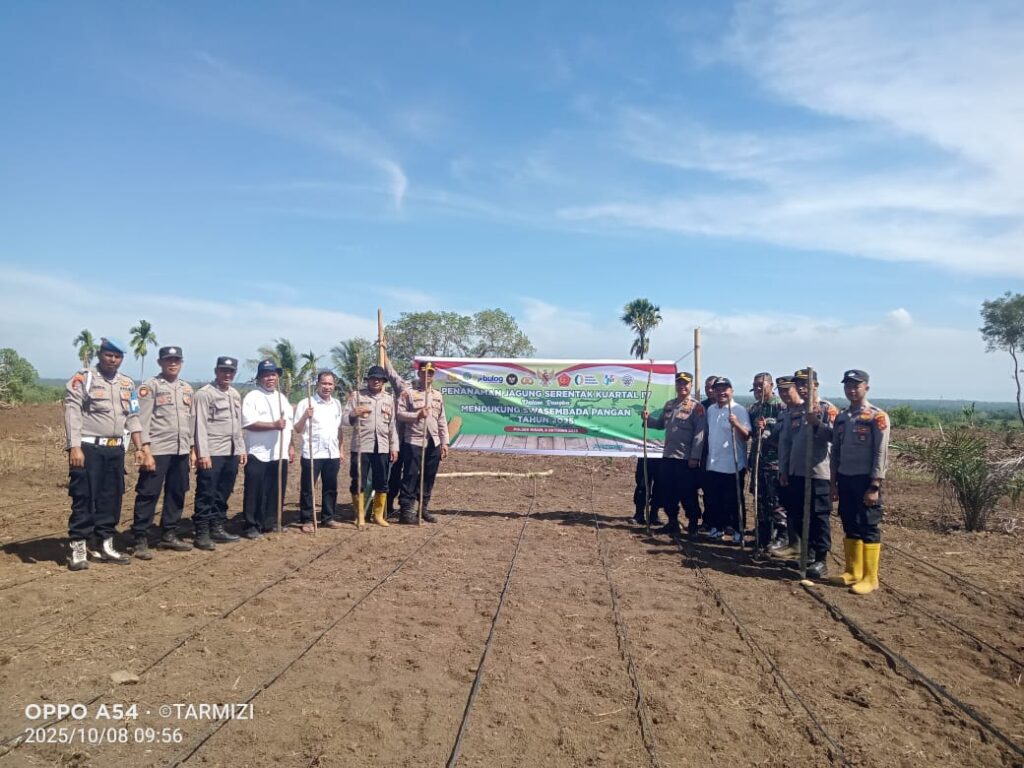 Aceh Utara – Dalam rangka mendukung program pemerintah menuju swasembada pangan nasional tahun 2025, Polsek Nisam Polres Lhokseumawe bersama unsur Muspika Kecamatan Banda Baro dan kelompok tani binaan melaksanakan penanaman jagung serentak kuartal IV di lahan kelompok Hudep Makmu Beusare Desa Jamuan, Kecamatan Banda Baro, Kabupaten Aceh Utara, Rabu (8/10/2025) pagi.