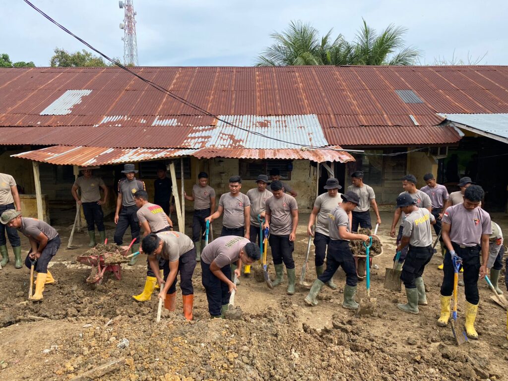 Tampak sejumah Polres Lhokseumawe dan Brimkb Kaltim turun langsung membersihkan lumpur yang mengendap, mengangkat material sisa banjir, serta mengevakuasi sampah dari lingkungan asrama. Kegiatan dilakukan secara kolaboratif dan penuh kekompakan sebagai bentuk nyata sinergi antar satuan serta kepedulian terhadap fasilitas yang terdampak bencana.