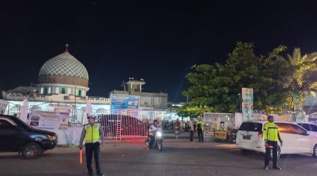 Lhokseumawe – Personel Sat Lantas Polres Lhokseumawe menggelar kegiatan pengaturan lalu lintas dan Blue Light Patrol menjelang salat tarawih di Masjid Jamik, Desa Lancang Garam, Kecamatan Banda Sakti, Kota Lhokseumawe, pada Selasa (25/3/2025) malam.