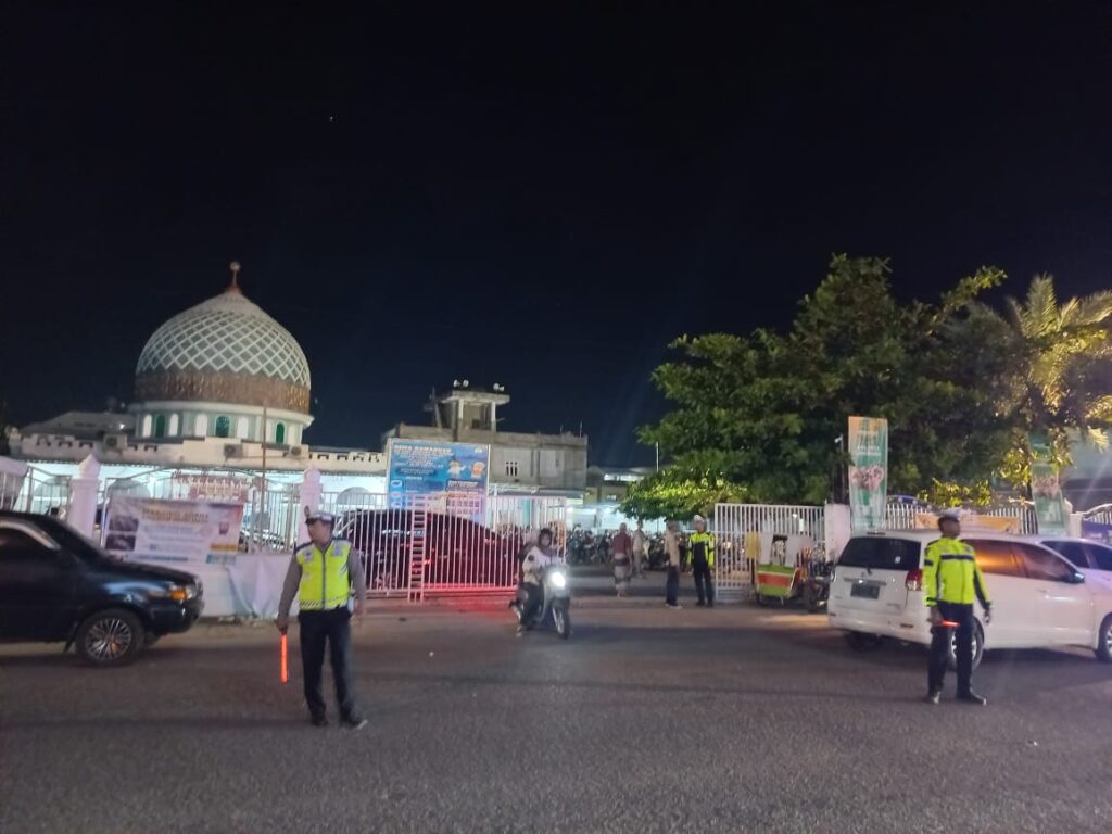 Petugas melakukan pengaturan arus kendaraan di sekitar area masjid guna mencegah kemacetan dan mengantisipasi kecelakaan. Selain itu, Blue Light Patrol dilakukan untuk meningkatkan kewaspadaan serta mencegah tindak kejahatan di lingkungan sekitar tempat ibadah.