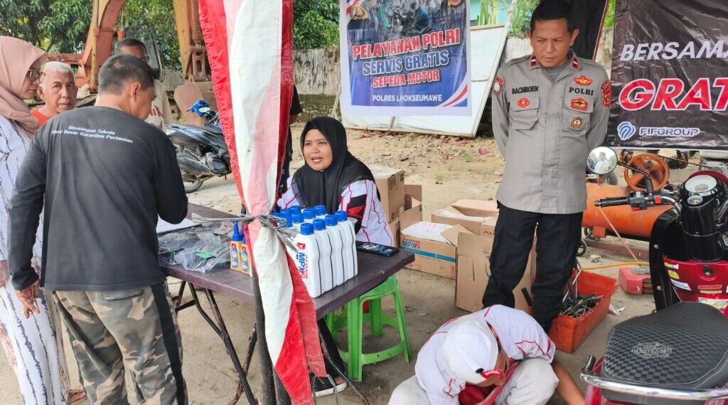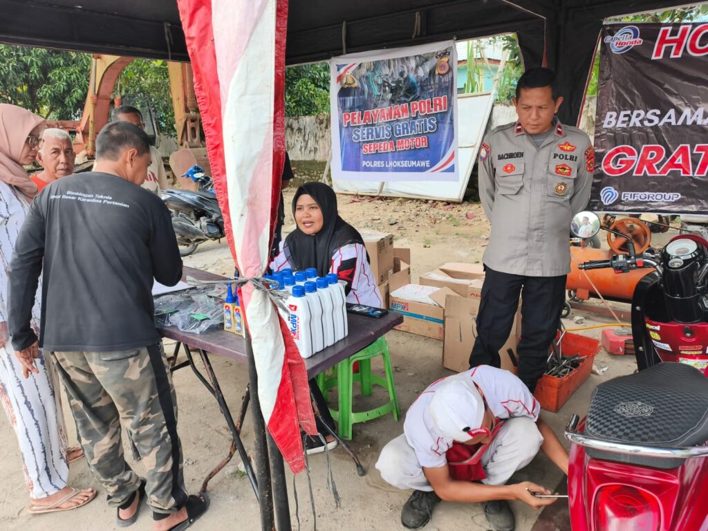 Aceh Utara — Dalam rangka meningkatkan pelayanan serta mempererat hubungan antara Polri dan masyarakat, Sat Binmas Polres Lhokseumawe bekerja sama dengan Dealer Honda UD. Prima Nusantara melaksanakan kegiatan servis motor keliling dan cuci motor gratis bagi masyarakat terdampak banjir, Selasa (23/12/2025).