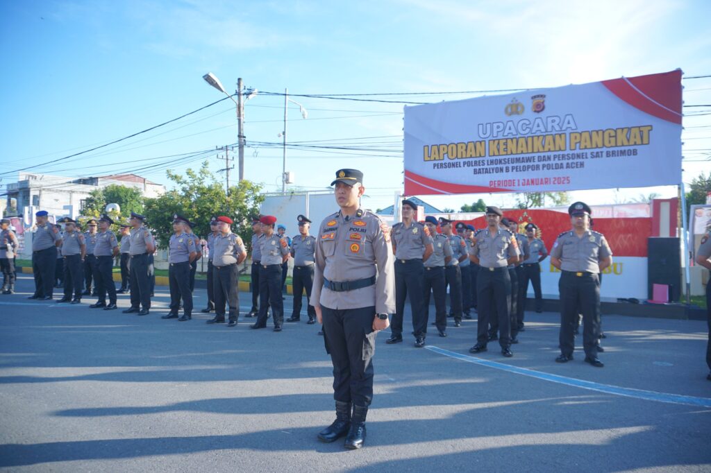 LHOKSEUMAWE – Polres Lhokseumawe melaksanakan upacara laporan kenaikan pangkat personel Polres Lhokseumawe dan personil dari Satuan Brimob Yon B Pelopor Polda Aceh yang menerima kenaikan pangkat TMT 1 Januari 2025.