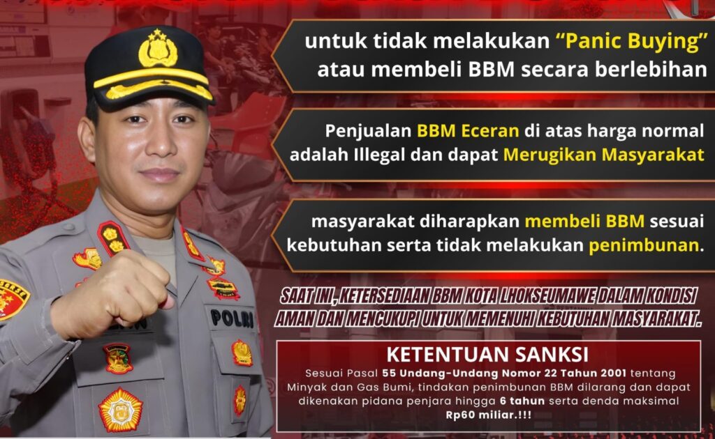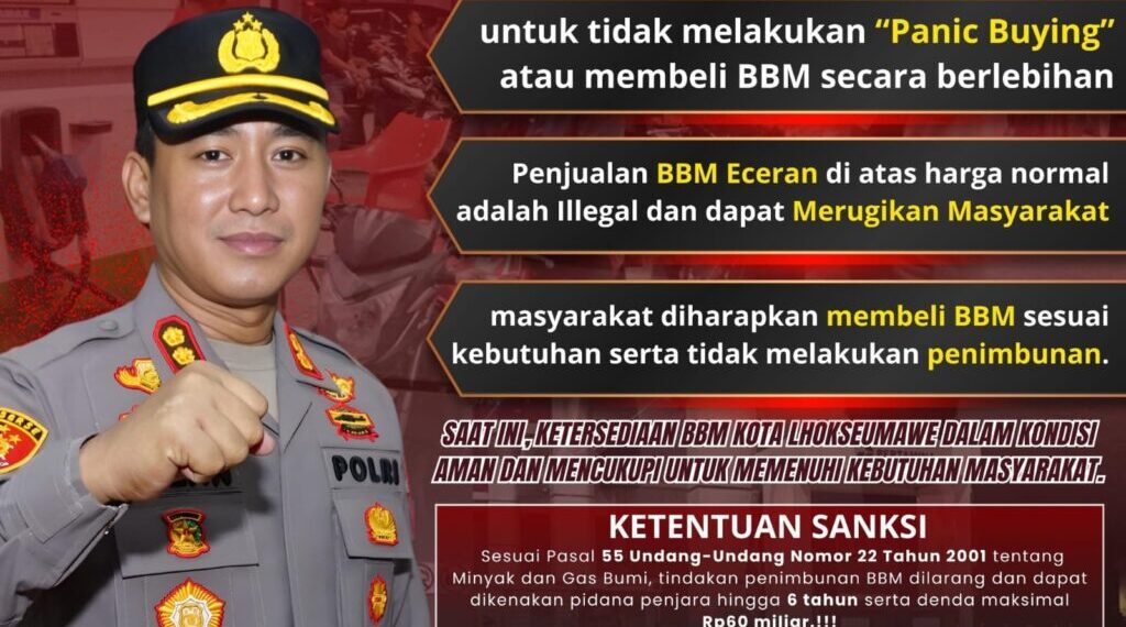Lhokseumawe — Polres Lhokseumawe mengimbau masyarakat agar tidak melakukan panic buying atau membeli bahan bakar minyak (BBM) secara berlebihan, kamis (6/3/2026). Imbauan tersebut disampaikan sebagai upaya menjaga stabilitas distribusi BBM serta mencegah terjadinya kelangkaan di tengah masyarakat.