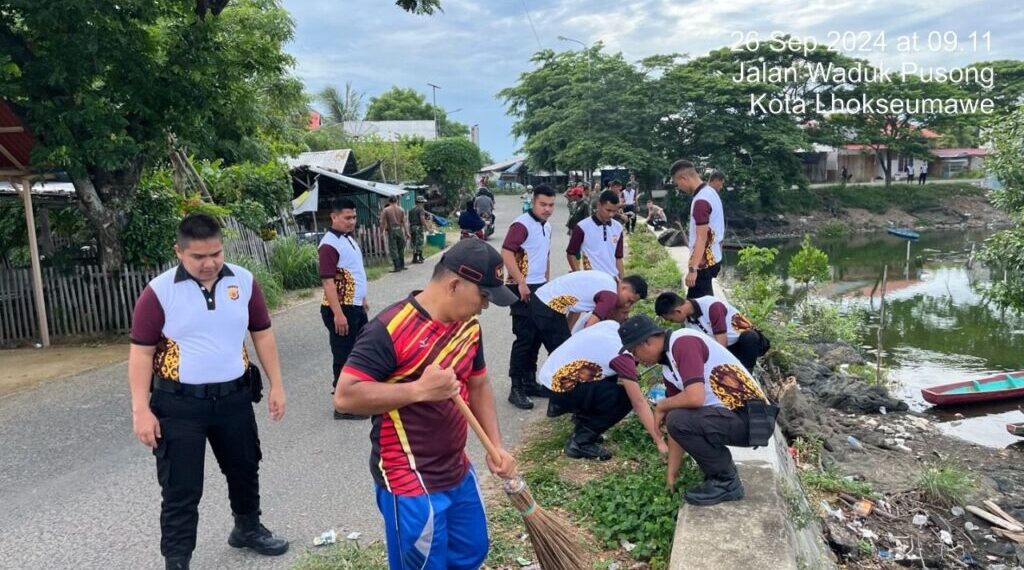 LHOKSEUMAWE – Dalam rangka memperingati HUT TNI ke-79, Polres Lhokseumawe bersama jajaran TNI di wilayah Lhokseumawe melaksanakan kegiatan karya bakti kebersihan di seputaran Waduk Kota Lhokseumawe, Kamis (26/9/2024). Kegiatan dimulai pukul 08.00 WIB dan melibatkan personel gabungan dari Polres Lhokseumawe beserta Polsek jajaran, serta jajaran TNI AD, AU, dan AL.