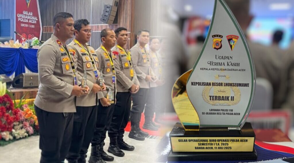Banda Aceh – Polres Lhokseumawe kembali menorehkan prestasi membanggakan dengan meraih penghargaan sebagai peringkat kedua terbaik dalam lomba layanan Polisi 110 Se-jajaran Res/Ta Polda Aceh. Penghargaan tersebut diberikan dalam acara Gelar Operasional Biro Operasi Polda Aceh Semester I Tahun 2025 yang digelar di Mapolda Aceh, Jum’at pagi (11/7/2025).