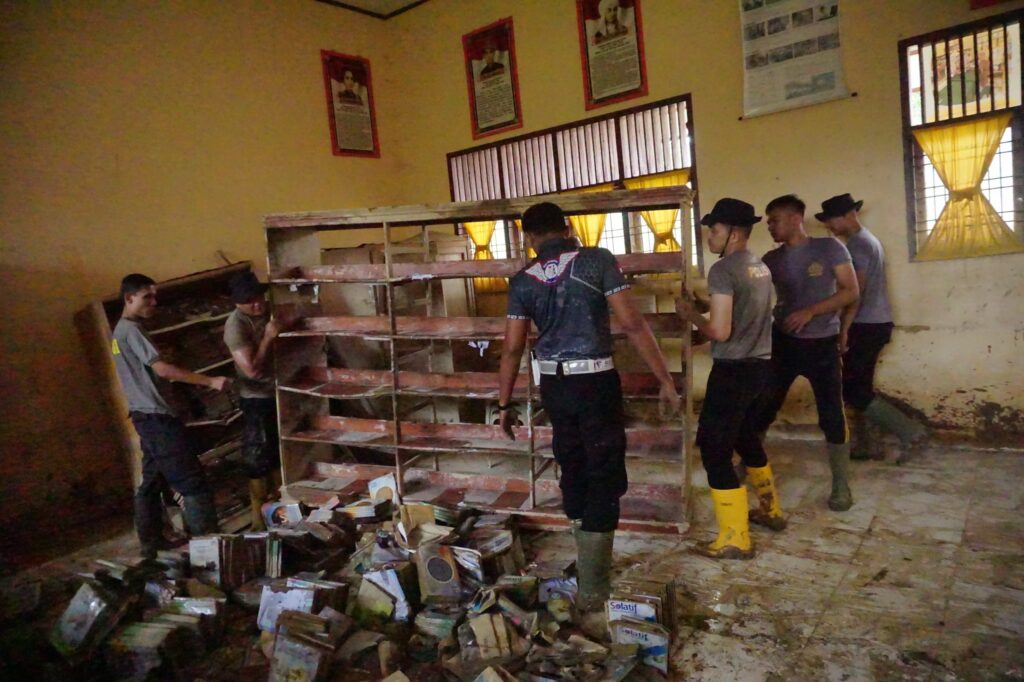Sejak pukul 09.00 WIB, personel Polres Lhokseumawe bersama personel Polsek Muara Batu dan Brimob Kompi I Yon B Jeulikat bahu-membahu membersihkan lumpur yang menutupi ruang kelas, ruang dewan guru, lorong sekolah, serta halaman sekolah akibat banjir.