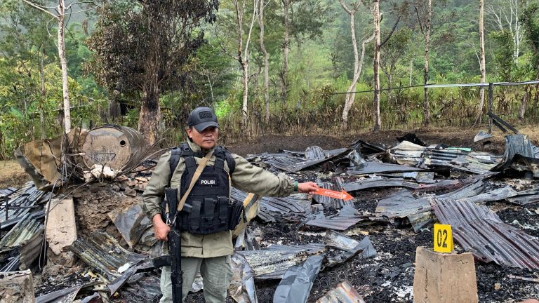 Yahukimo — Personel Satgas Gakkum Operasi Damai Cartenz 2025 melakukan kegiatan evakuasi dan olah tempat kejadian perkara (TKP) atas insiden penyerangan terhadap guru honorer dan tenaga kesehatan serta pembakaran fasilitas publik di Distrik Anggruk, Kabupaten Yahukimo, Senin (24/3).