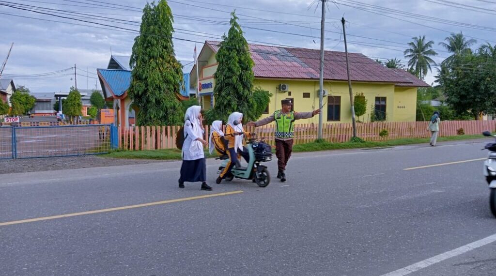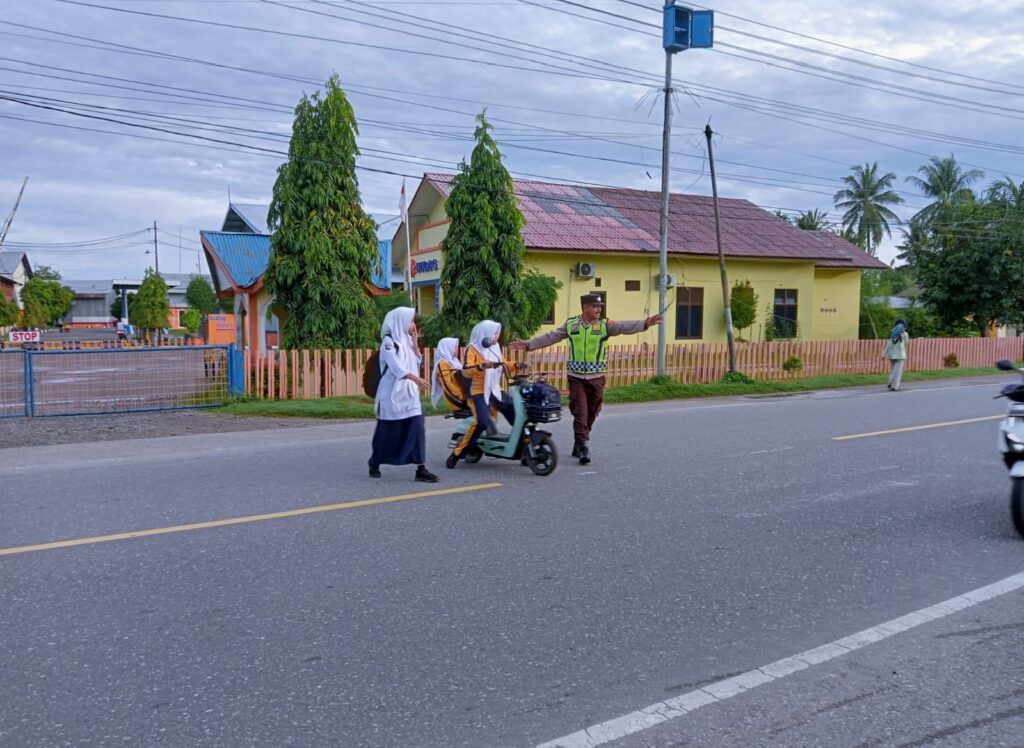 Lhokseumawe – Personel Polsek Blang Mangat melaksanakan kegiatan strong point berupa pengamanan dan pengaturan arus lalu lintas di Jalan Raya Medan–Banda Aceh, tepatnya di Desa Ule Blang Mane, Kecamatan Blang Mangat, Kota Lhokseumawe, Selasa (5/8/2025) pagi.