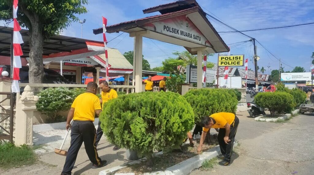 Lhokseumawe – Personel Polsek Muara Satu Polres Lhokseumawe melaksanakan apel pagi yang dilanjutkan dengan kegiatan gotong royong (kurve) membersihkan halaman Mapolsek, Jumat (29/8/2025) pukul 08.30 WIB.