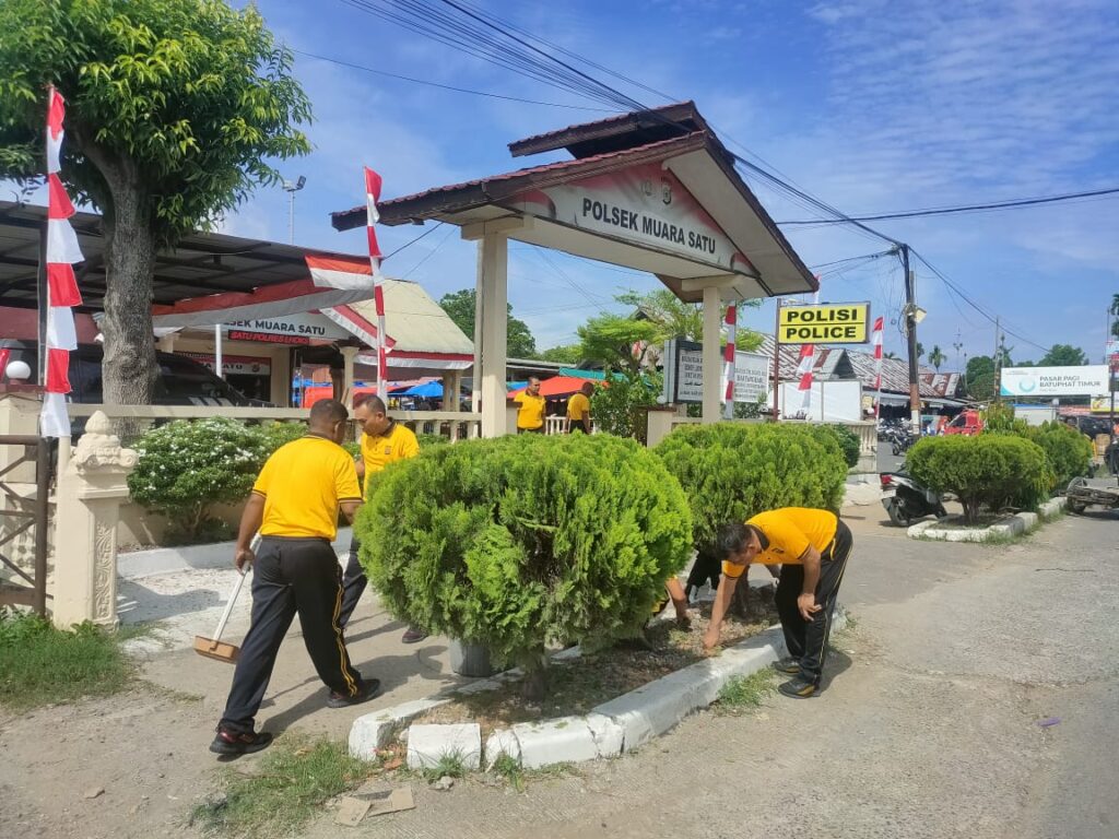 Lhokseumawe – Personel Polsek Muara Satu Polres Lhokseumawe melaksanakan apel pagi yang dilanjutkan dengan kegiatan gotong royong (kurve) membersihkan halaman Mapolsek, Jumat (29/8/2025) pukul 08.30 WIB.