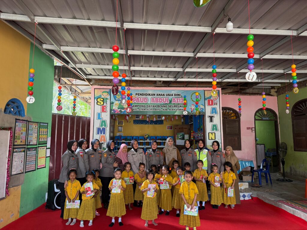 Dalam kegiatan tersebut, Polwan Polres Lhokseumawe menyalurkan berbagai bantuan kebutuhan dasar berupa sembako, perlengkapan bayi, selimut, makanan, perlengkapan kebersihan, serta mainan dan alat belajar kepada anak-anak Kelompok Bermain (KB) Yayasan Pendidikan Islam Abdul Aziz.