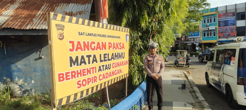 Lhokseumawe – Dalam rangkaian Operasi Patuh Seulawah 2025, Satuan Lalu Lintas Polres Lhokseumawe terus gencar menyuarakan pentingnya keselamatan berkendara. Salah satu upaya preventif yang dilakukan adalah pemasangan spanduk imbauan bertuliskan “Jika Lelah dan Mengantuk, Silakan Beristirahat”, di depan Pos Lantas Cunda, Jalan Merdeka Timur, dan di Jalan Medan–Banda Aceh, tepatnya depan Makam Pahlawan, Desa Blang Panyang, Kota Lhokseumawe, Rabu (23/7/2025).