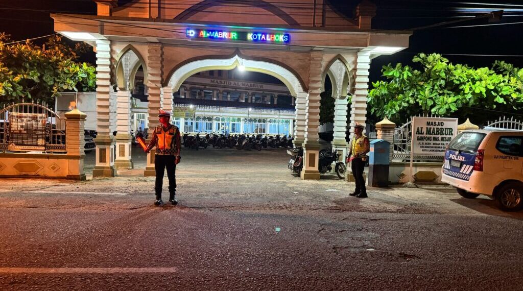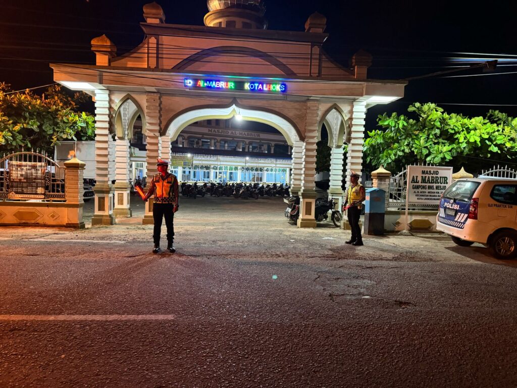 Lhokseumawe – Personel Satlantas Polres Lhokseumawe melaksanakan pengaturan arus lalu lintas dan blue light patrol di sekitar Masjid Al-Mabrur, Desa Mns. Mesjid, Kecamatan Muara Dua, Kota Lhokseumawe, Minggu (23/3/2025) malam.