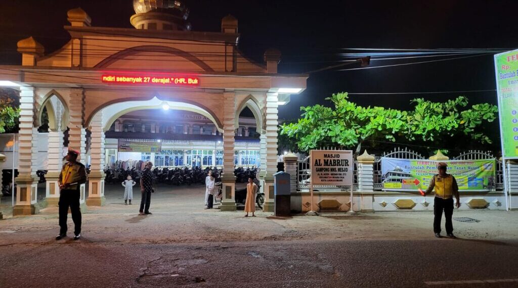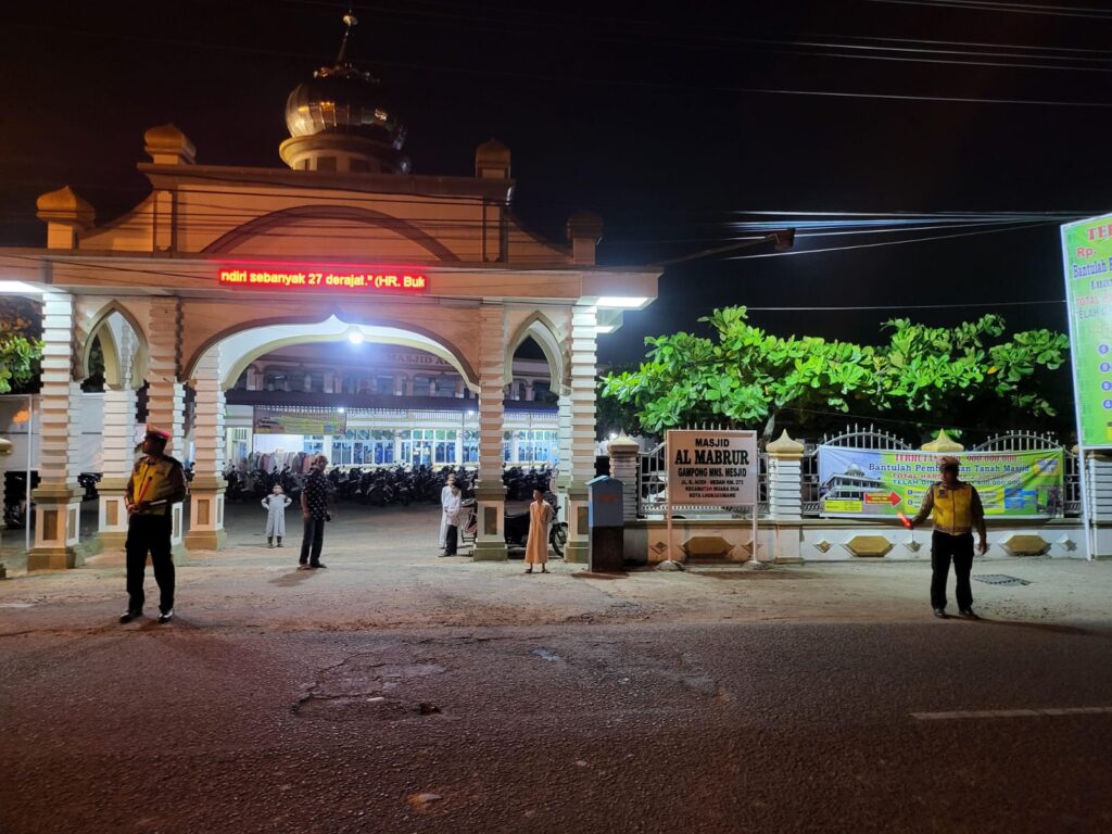 Pengamanan yang dimulai sejak pukul 20.00 WIB ini dipimpin langsung oleh Kasat Lantas Polres Lhokseumawe bersama personel Satlantas. Salah satu lokasi utama pengamanan adalah di sekitar Masjid Al Mabrur, Desa Meunasah Mesjid, Kecamatan Muara Dua, Kota Lhokseumawe, yang menjadi pusat aktivitas ibadah warga setempat.