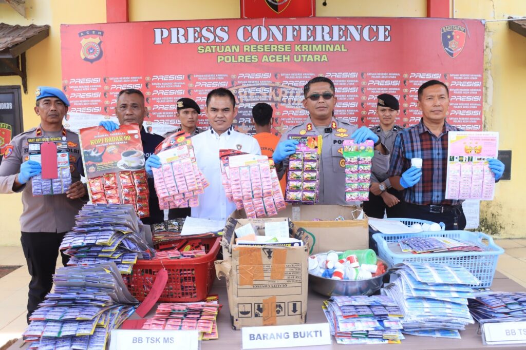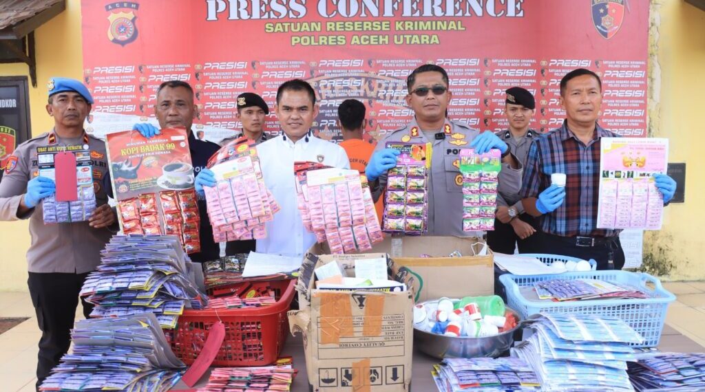 LHOKSUKON – Satuan Reserse Kriminal (Satreskrim) Polres Aceh Utara berhasil membongkar peredaran obat-obatan dan jamu palsu yang beredar di wilayah Aceh Utara dan Aceh Timur. Dalam kasus ini, polisi mengamankan dua orang tersangka beserta sejumlah barang bukti berupa obat-obatan dan jamu tradisional palsu. Hal tersebut diungkap dalam konferensi pers yang digelar di Mapolres Aceh Utara pada Kamis (27/2/2025).