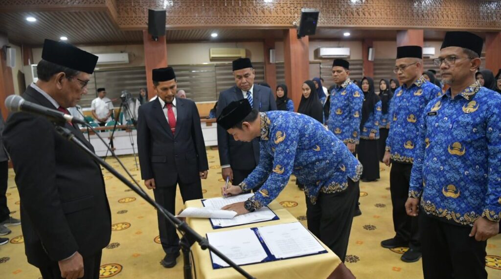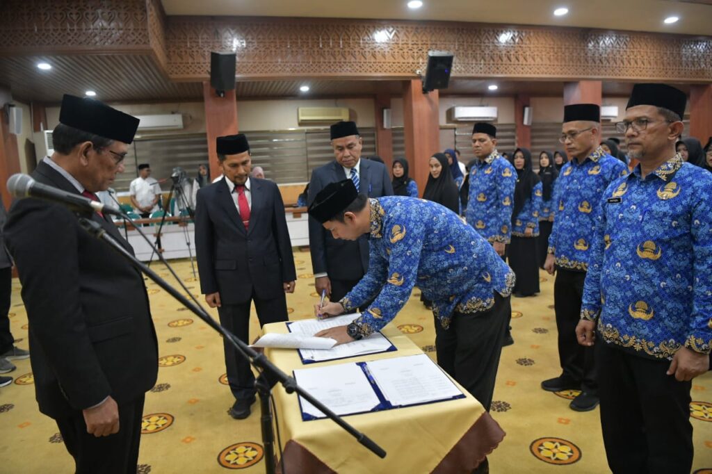 Banda Aceh – beritamerdeka.net Asisten Administrasi Umum Sekda Aceh, Muhammad Diwarsyah, mengukuhkan 610 pejabat administrator dan pengawas dalam lingkungan Pemerintah Aceh, di Gedung Serbaguna Kantor Gubernur Aceh, Jumat, (3/10/2025).