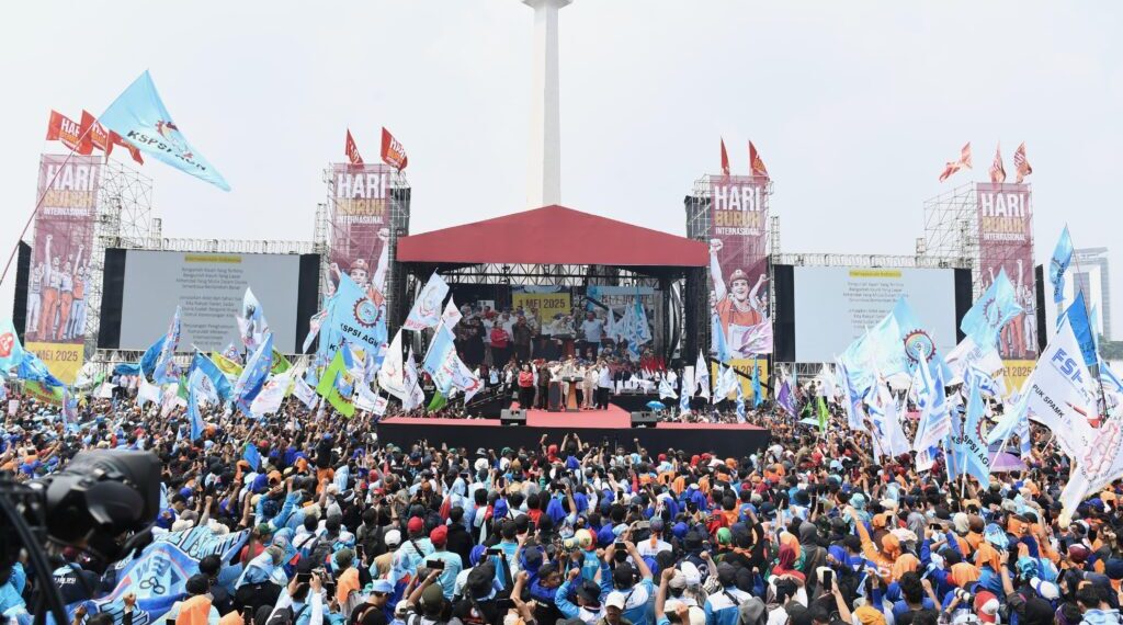 Jakarta- Peringatan Hari Buruh Internasional di Monumen Nasional, Kamis (01/05/2025) dihadiri langsung oleh Presiden Prabowo Subianto. Acara ini dihadiri lebih dari 200 ribu buruh dan pekerja dari berbagai daerah di tanah air. Mereka berkumpul untuk menyampaikan aspirasinya dalam momentum yang diperingati setiap tahunnya ini.