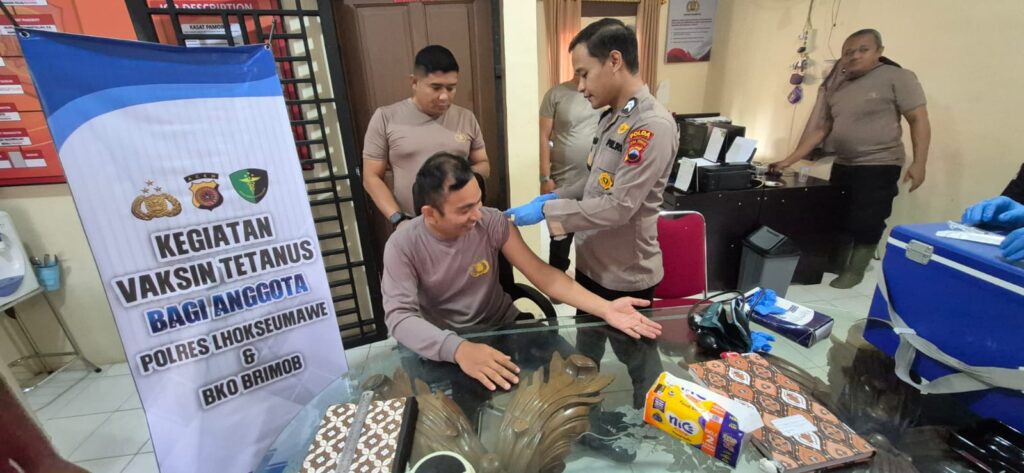 LHOKSEUMAWE – Seksi Kedokteran dan Kesehatan (Sidokkes) Polres Lhokseumawe melaksanakan kegiatan bakti kesehatan (baktikes) berupa pemberian vaksin tetanus dan pembagian vitamin kepada personel Polres Lhokseumawe dan personel BKO Brimob, Kamis (29/1/2026).