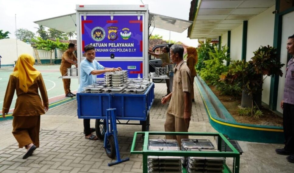 DIY – Untuk pertama kalinya, Dapur SPPG (Satuan Pelayanan Pemenuhan Gizi) milik Polda DIY yang berlokasi di Mako Batalyon B Satbrimob Polda DIY menyalurkan paket makan bergizi gratis kepada siswa sekolah pada hari Senin 14 Juli 2025 kemarin.