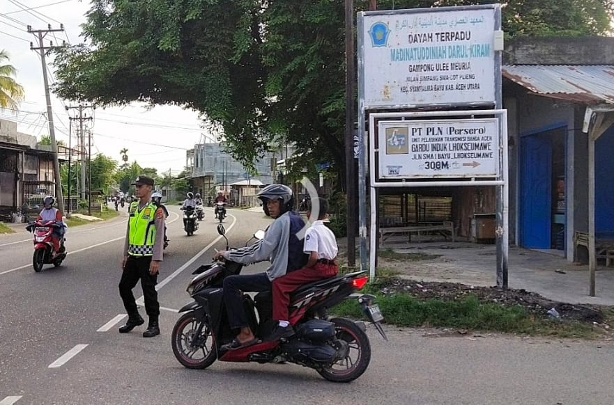Aceh Utara – Kehadiran polisi di pagi hari tidak hanya sebatas mengatur arus lalu lintas, tetapi juga menjadi sahabat bagi para pelajar. Hal itu terlihat saat personel Polsek Syamtalira Bayu melaksanakan strong point pagi di Simpang Cot Plieng, Jalan Raya Medan–Banda Aceh, Kamis (18/9/2025).
