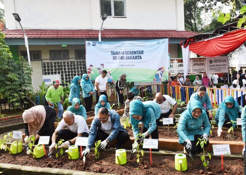 Jakarta – Kegiatan Tanam Serentak yang dilaksanakan Dinas Ketahanan Pangan, Kelautan dan Pertanian (KPKP) bersama PKK se-DKI Jakarta digelar secara hybrid di seluruh wilayah Jakarta dengan enam titik tanam utama mewakili lima kota dan satu kabupaten, Jumat (18/7).