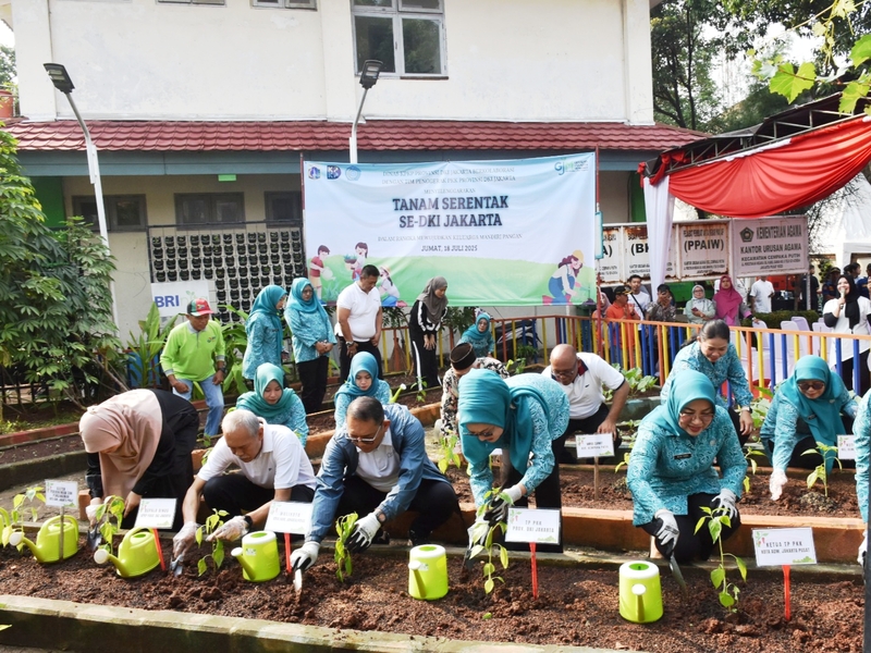 Jakarta – Kegiatan Tanam Serentak yang dilaksanakan Dinas Ketahanan Pangan, Kelautan dan Pertanian (KPKP) bersama PKK se-DKI Jakarta digelar secara hybrid di seluruh wilayah Jakarta dengan enam titik tanam utama mewakili lima kota dan satu kabupaten, Jumat (18/7).