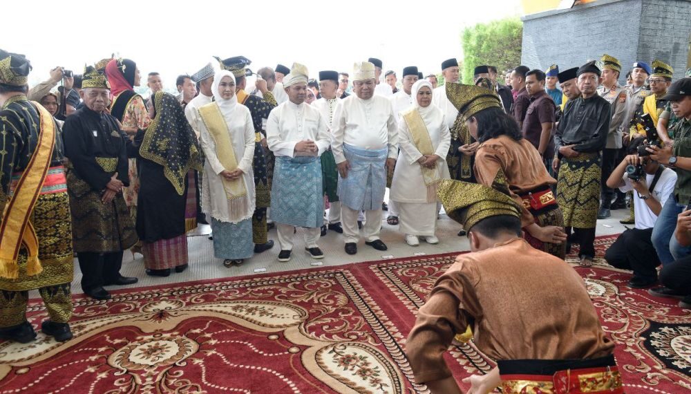 Kedatangan pemimpin Riau yang tiba pukul 13.50 tersebut disambut dengan prosesi adat Melayu, seperti kompang, pemasangan tanjak dan selempang oleh Lembaga Adat Melayu Riau (LAMR).