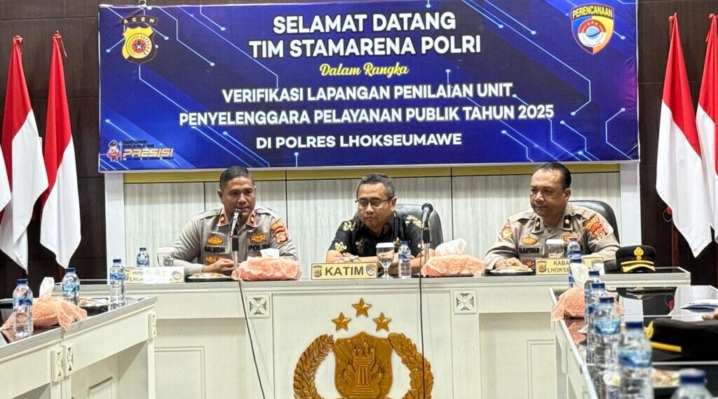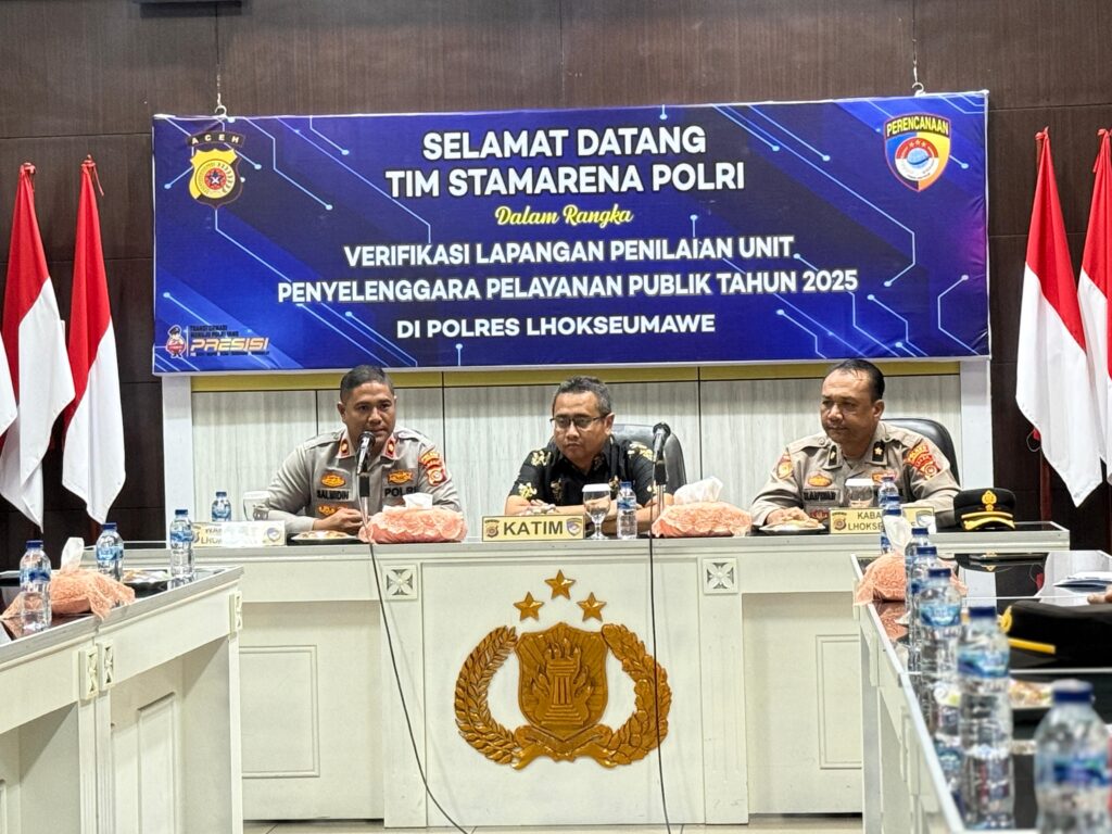 Lhokseumawe – Upaya meningkatkan kualitas layanan kepada masyarakat terus dilakukan Polres Lhokseumawe. Hal ini dibuktikan dengan pelaksanaan verifikasi lapangan penilaian unit penyelenggara pelayanan publik tahun 2025 oleh Tim Stamarena Mabes Polri, Rabu (30/7/2025).