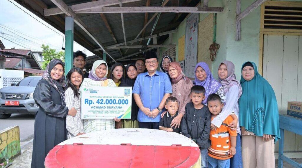 Santunan dari BPJS Ketenagakerjaan Jambi diserahkan Wali Kota Jambi, Maulana, didampingi Kepala Dinas Ketenagakerjaan Kota Jambi, serta Kepala Dinas DMPPA, Senin 7/4/2025.