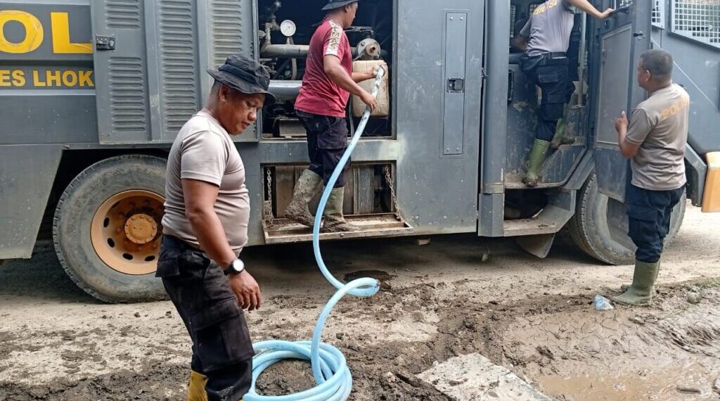 LHOKSEUMAWE – Polres Lhokseumawe mengerahkan kendaraan taktis water canon sebagai andalan untuk membersihkan sekolah dan masjid yang terdampak lumpur pascabanjir di sejumlah wilayah hukum Polres Lhokseumawe.