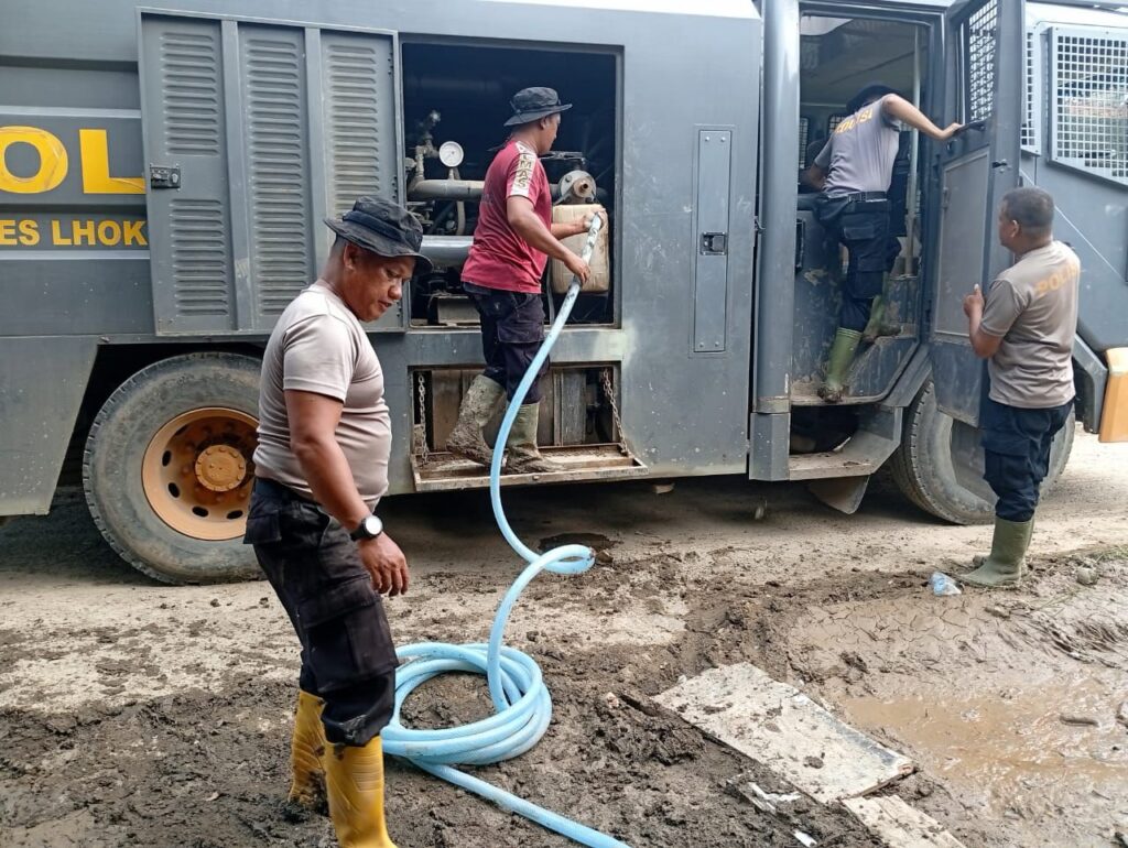 LHOKSEUMAWE – Polres Lhokseumawe mengerahkan kendaraan taktis water canon sebagai andalan untuk membersihkan sekolah dan masjid yang terdampak lumpur pascabanjir di sejumlah wilayah hukum Polres Lhokseumawe.